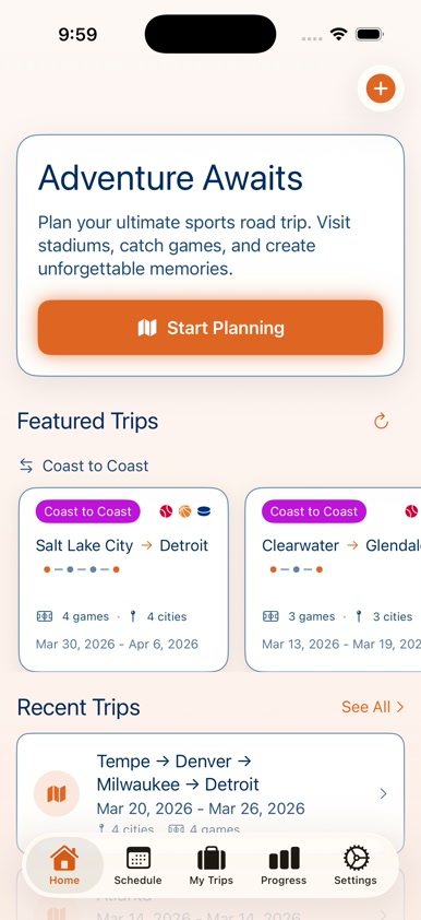 screen recording across the app: auto-scrolling Featured Trips carousel,