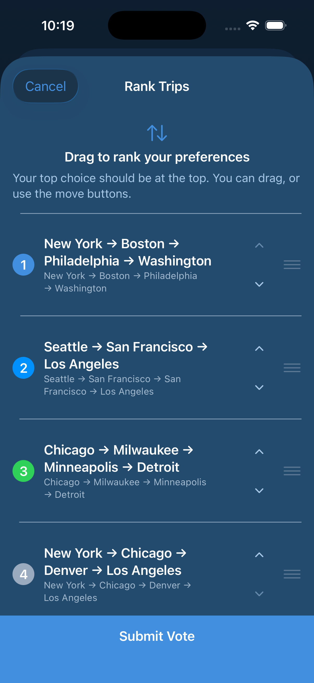 and trip options auto-sort with scroll.